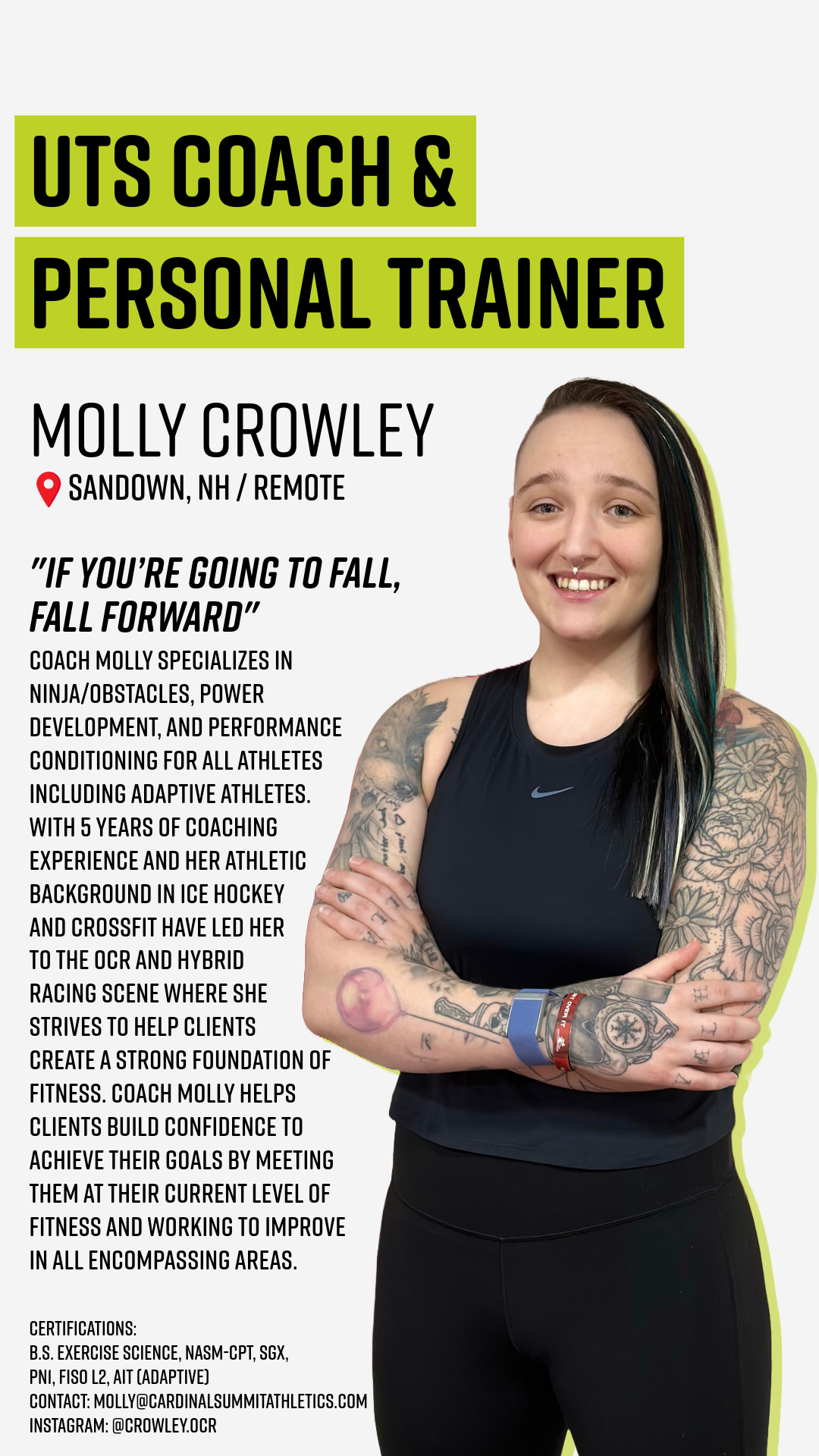 | Molly Crowley | Ninja, Obstacle Course Racing, Adaptive Athletes | Molly@cardinalsummitathletics.com | @crowley.ocr |